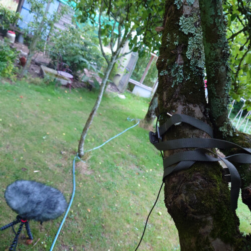 Die Audiodaten der Sensoren bilden eine Klangquelle, die zweite entsteht aus den Umgebungsgeräuschen rund um den Baum, die ich mit Mikrofonen aufnehme. Aus diesen beiden Ebenen entsteht ein komplexes Hörbild, das sowohl die äußeren Sounds des Waldes als auch die inneren Schwingungen und Resonanzen des Holzes umfasst.
